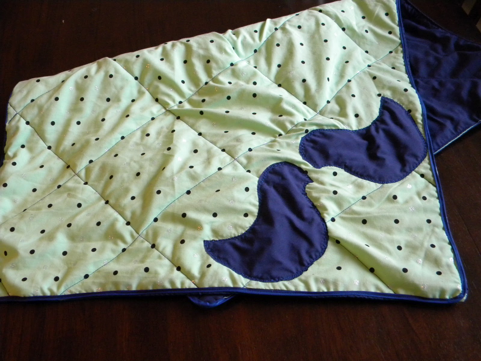 Today I scrambled through my meagre fabric stash to see what I had in there..I had this brilliant idea that I was going to give a baby quilt/play mat a go today (after finally giving up on the housework. The bathroom is clean, I smell like a Exit Mould) I only had two pieces of fabric large enough to make a quilt with, some green spotty fabric and some dark blue cotton which worked out well because it means now I have a unisex quilt to add to my baby box. I also discovered I had no batting either and being too broke to go buy some more (as usual) I fished out a piece of old pink mink that was faded and used two layers of that instead. And then I set to it! And voila! It didn't turn out so bad :o) The only bias binding I had was 1cm wide and at first I tried in vain to wrap it over the outside edge but as you can guess, that failed. So I cheated and folded it in half and topstitched it on instead! That worked!